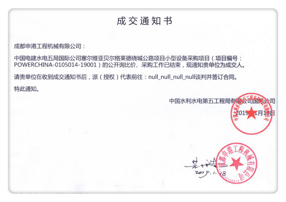 2019年1月18日,我公司收到中國電建水電五局國際公司發(fā)來的關(guān)于塞爾維亞貝爾格萊德繞城公路項(xiàng)目小型設(shè)備采購項(xiàng)目的“成交通知書”,我公司為成交人,目前該設(shè)備已用木箱包裝完畢,準(zhǔn)備發(fā)往指定港口。