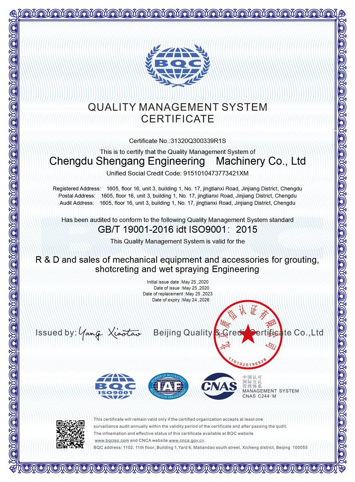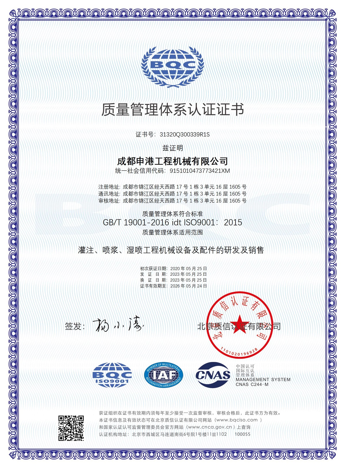 5月25日,成都申港工程機械有限公司完成《質(zhì)量管理體系認證證書》換證工作,標志著成都申港公司質(zhì)量管理體系工作再次得到中國質(zhì)量認證中心關于ISO9001質(zhì)量管理體系的認證和審核。