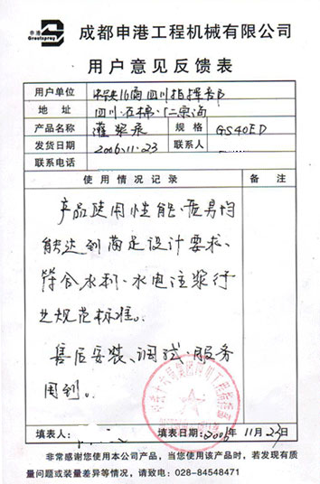 2006年11月23日,田灣河流域仁宗海電站中鐵十六局項(xiàng)目部將GS40ED雙液灌漿泵的使用情況返回我公司,對設(shè)備進(jìn)行了評定。(見《用戶意見反饋表》)。